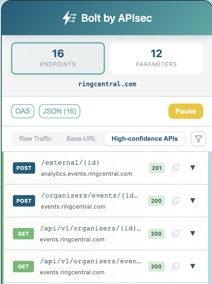 Traffic Mode 1. Hit Start and browse normally; Bolt listens to browser traffic and instantly lists calls. 2. Use filters: Raw, Base URL Only, or High‑Confidence Endpoints, or refine with your own custom filters. 3. Click any item to view method, path, parameters, and sample payloads. 4. Switch to Parameter Mode to see a consolidated parameter inventory and usage. 5. Click Export to download an OpenAPI spec for everything captured.